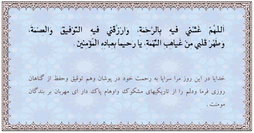 خدايا مرا در اين ماه به رحمت خود فراگير، و توفيق و پاکدامنی روزيم ساز، و دلم را از تاريکيهای تهمت پاک گردان، ای مهربان به بندگان مؤمن خود.