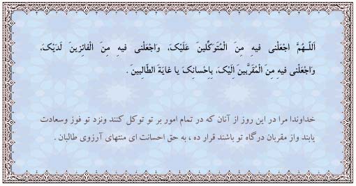 اللّهُمَّ اجعَلنی فیهِ مِنَ المُتَوَکِّلینَ عَلیکَ وَاجعَلنی فیهِ مِنَ الفائِزینَ لَدَیکَ وَاجعَلنی فیهِ مِنَ المُقَرَّبینَ اِلَیکَ بِاِحسانِکَ یا غایَةَ الطّالِبینَ