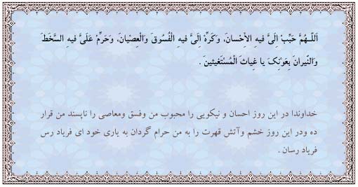 اللهمّ حَبّبْ الیّ فیهِ الإحْسانَ وكَرّهْ الیّ فیهِ الفُسوقَ والعِصْیانَ وحَرّمْ علیّ فیهِ السّخَطَ والنّیرانَ بِعَوْنِكَ یا غیاثَ المُسْتغیثین