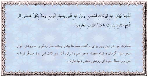 «اللهمّ نَبّهْنی فیهِ لِبَرَكاتِ أسْحارِهِ و نوّرْ فیهِ قلبی بِضِیاءِ أنْوارِهِ و خُذْ بِكُلّ أعْضائی الى اتّباعِ آثارِهِ بِنورِكَ یا مُنَوّرَ قُلوبِ العارفین»
