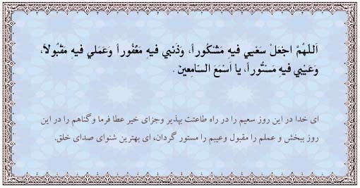 اللَّهُمَّ اجْعَلْ سَعْيِى فِيهِ مَشْكُورا وَ ذَنْبِى فِيهِ مَغْفُورا وَ عَمَلِى فِيهِ مَقْبُولا وَ عَيْبِى فِيهِ مَسْتُورا يَا أَسْمَعَ السَّامِعِينَ.