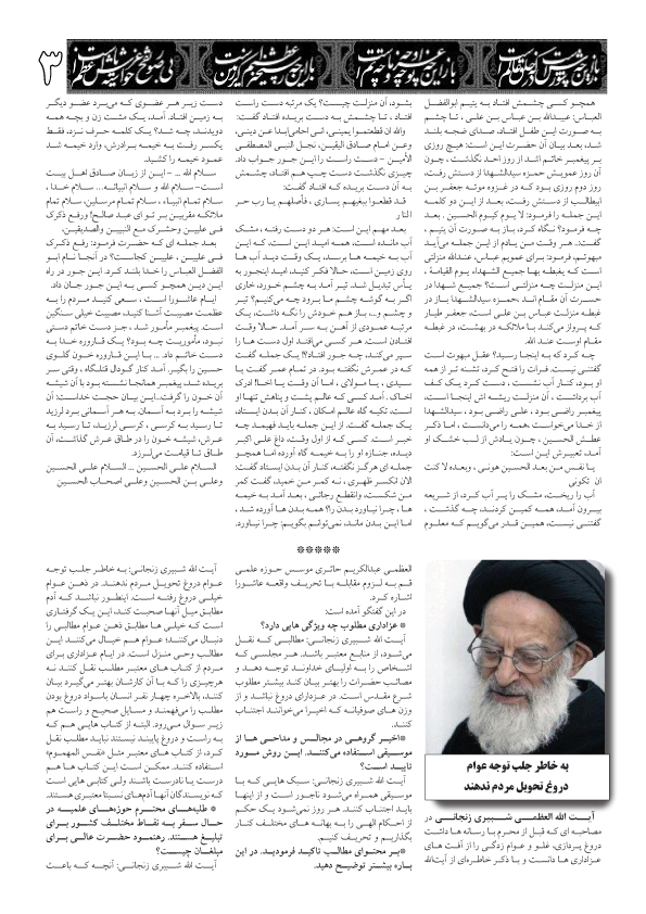 آیت الله شبیری زنجانی: به خاطر جلب توجه عوام دروغ تحویل مردم ندهند. در ذهن عوام خیلی دروغ رفته است. اینطور نباشد که آدم مطابق میل آنها صحبت کند، این یک گرفتاری است که خیلی ها مطابق ذهن عوام مطالبی را دنبال می کنند؛ عوام هم خیال می کنند این مطالب وحی منزل است. در ایام عزاداری برای مردم از کتاب های معتبر مطلب نقل کنند نه هرچیزی را که با آن کارشان بهتر می گیرد بیان کنند، بالاخره چهار نفر انسان باسواد دروغ بودن مطلب را می فهمند و مسایل صحیح و راست هم زیر سوال می رود. البته از کتاب هایی هم که به راست و دروغ پایبند نیستند نباید مطلب نقل کرد، از کتاب های معتبر مثل «نفس المهموم» استفاده کنند. ممکن است این کتاب ها هم درست یا نادرست باشند ولی کتابی هایی است که نویسندگان آنها آدم های نسبتا معتبری هستند.