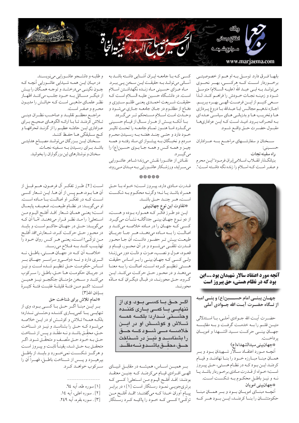 حضرت آیت الله جوادی آملی: آنچه مورد اعتقاد سالار شهیدان بوده و بر همان مبنا مبارزه خود را بنا نهادند و قیام کردند این بود که در نظام هستی، حق پیروز است.